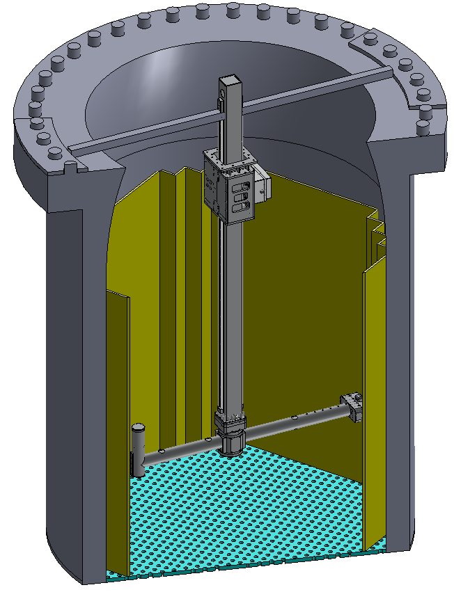 The robotic system consists of center mast, vertical gear box, indexing positioning arm, rotational gear box, counter-weight, laser scanning/camera measuring head and control unit. The robot is secured and centered by a cross piece or frame that attaches on the reactor flange supplied by the customer or can be supplied by Global Nuclear Associates (GNA). (https://www.globalnuclearassociates.com)